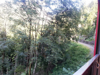 Dağlık yamaçlarda yol alıyoruz, aşağısı uçurum, yukarı doğru dağın yamacı yükseliyor. Aşağıda ise hep bir su akıyor. Kimi zaman uçurumun dibinde, kimi zaman demiryoluyla aynı seviyede. Suyun rengi açık yeşil, şu Nil yeşili dediklerinden ama Nil'le ilgisi olduğunu sanmam ( Hatta Nil'in bu renk olduğunu hiç sanmam!) Kıvrıla kıvrıla yol alıyor tren.